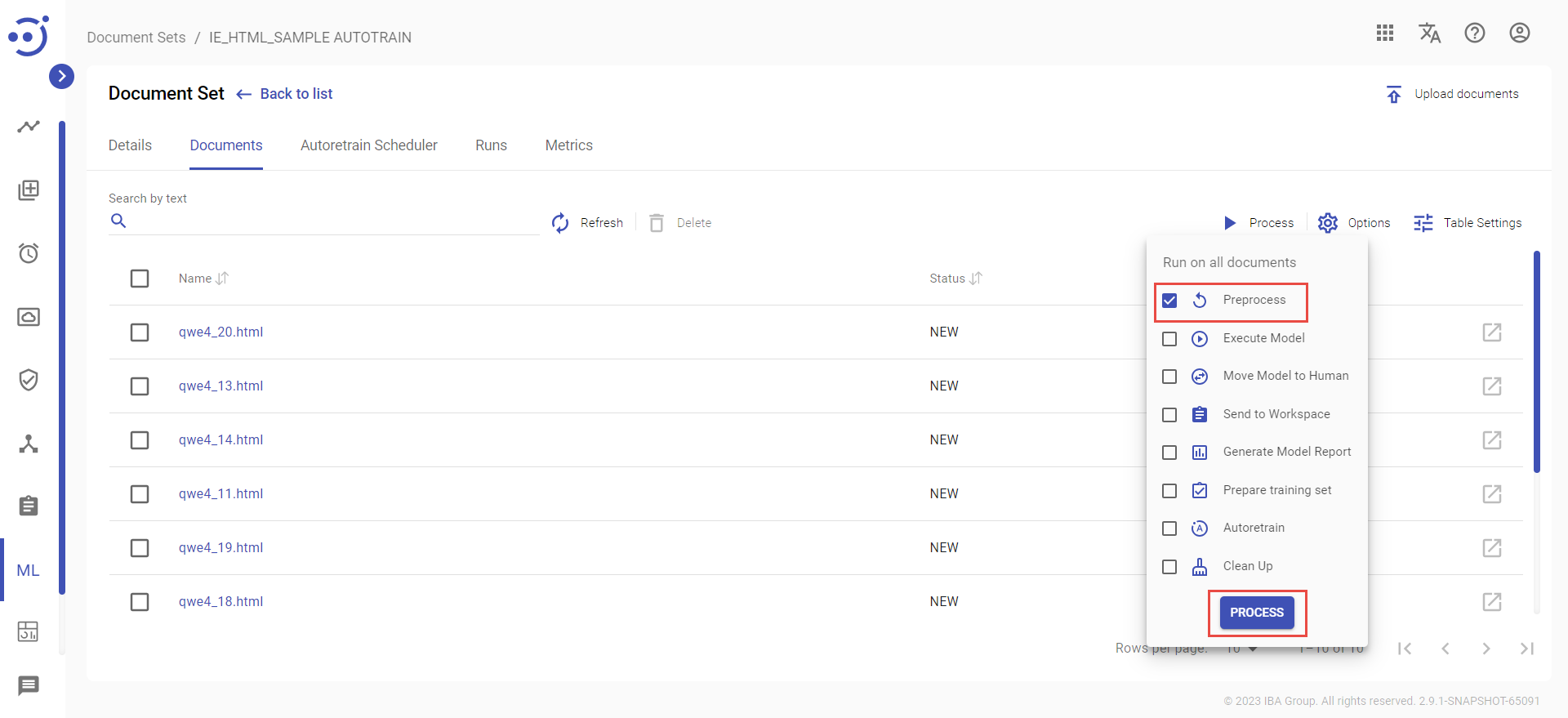 - Click the Process icon at the top of documents list.